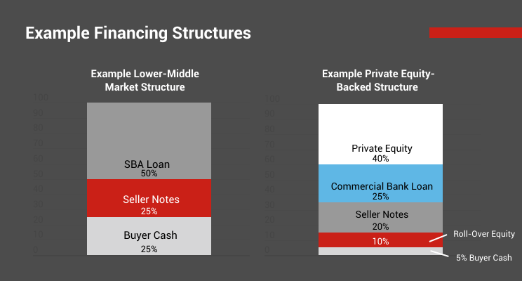 Most deals, at least in the middle market, employ multiple financing sources, rather than just one. For example, a typical lower-middle market transaction structure could see a buyer write an ‘equity check’ for 25% of the purchase price drawing on its own cash reserves, have the seller provide 25% of the price from in the form of seller notes and an SBA lender provide the balance (i.e. 50%).