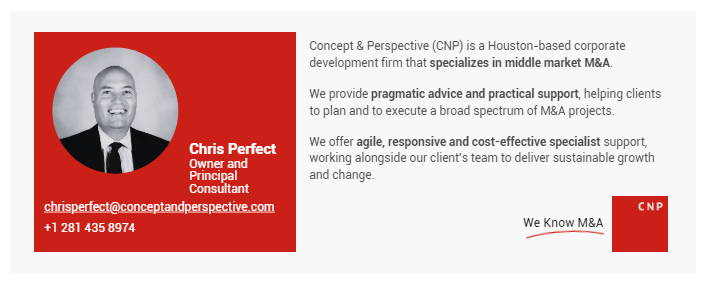 If M&A is on your ‘to do’ list for 2024 (or you think it should be), please reach out to me: chrisperfect@conceptandperspective.com +1-281-435-8974 so that we can discuss how Concept and Perspective, LLC can help.