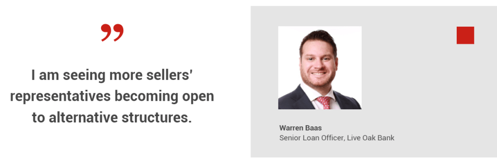 Warren Baas, a senior loan officer at specialist SBA lender Live Oak Bank, observed: “I am seeing more sellers’ representatives becoming open to alternative structures. The bank is now championing a performance-based seller financing model, where needed. This can help bridge a gap between a seller that seeks to justify the value of the business based on projected future earnings and a buyer that wants to mitigate the risk that those earnings do not materialize because, for example, a key customer is lost. In the situation where the performance metric is not met, the payments to seller are deferred until the next measurement period, leaving enough cash flow to cover just the SBA loan obligation.”