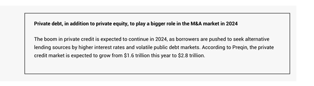 - Alternative deal structures (seller notes, earnouts, buyer equity, etc.) will remain a common feature of the 2024 deal landscape, particularly in the lower middle market. Similarly, private debt will be an essential supplement to bank lending for M&A.