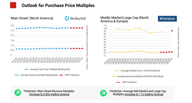 As more buyers return to the market/find funding for more deals, average purchase prices will be pushed up. We expect deal valuations in middle-market & large-cap businesses will align with those seen in late 2022. For smaller, ‘main street’ businesses we expect deals values to remaining reasonably flat, with a slight increase in the year’s second half.