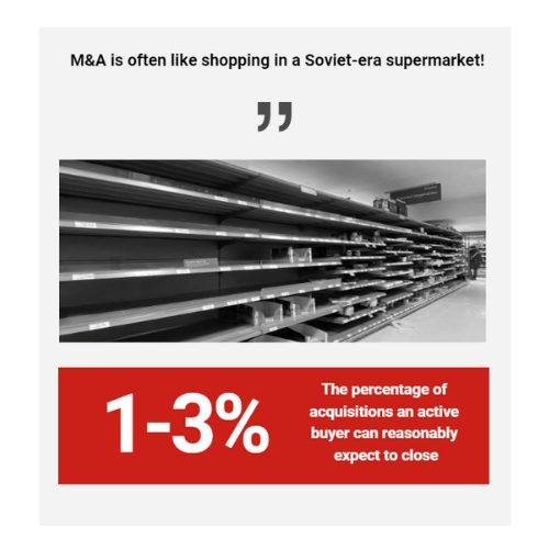 M&A is often like shopping in a Soviet-era supermarket: often what you want to buy is not for sale. If it is, it is in a different size or variety from the ideal and/or it is a price that does not fit your budget. That was the case with some aspect of this search – some of the search criteria were hard to meet and, based on client feedback, we evolved the search criteria as we went to ensure that there was a significantly large enough pool to targets to fill the pipeline. Volume is important as, on an unsolicited outreach, only between 1-3% of potential targets that are approached are likely to result in an successful deal.