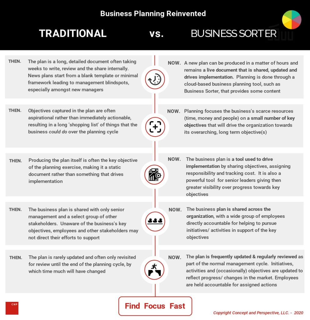 Agile, cloud-based business planning tools are shifting how businesses pursue growth and manage change. Key objectives and initiatives are captured and pursued using a dedicated planning tool. Business Sorter is a cloud-based tool that provides a comprehensive framework for developing a live plan allowing organizations to share, track progress and drive implementation.